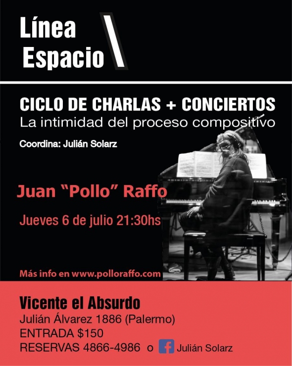 El tecladista, compositor, arreglador, director y docente Juan “Pollo” Raffo estará tocando algunos de sus temas y comentando sus métodos y estrategias compositivas (académicas o intuitivas). La propuesta invita al público a realizar preguntas y se utilizarán ejemplos de partituras o audio de grabaciones del autor.